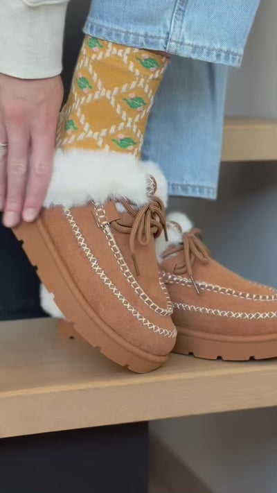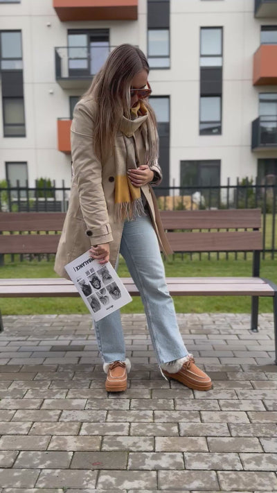 Tai avalynė, kuri atrodo taip, lyg ji pati galėtų jus priglausti – minkšta, šviesi, su aiškia nostalgijos užuomina, bet be jokios melancholijos. Karamelinės zomšos paviršius primena rankomis kurtą dalyką, kuris išgyveno sezonus, o baltas kailiukas, krentantis per kraštą, sukuria beveik sapnišką atmosferą – lyg sniegas susitikęs su saugumu. Nėriniuota priekinė dalis atveria folklorinę natą, kuri čia neišnaudojama iki galo – tik prisiliečiama, švelniai. Platforma subtiliai pakelia, bet netrukdo; jos tikslas – būti, ne rodyti. Šlepsenų siluetas su batais siejamu viršumi sukuria unikalų balansą tarp vidaus ir išorės, tarp namų intymumo ir pasirengimo išėjimui, kai švelnumas tampa tavo aprangos esme, o ne detalė.