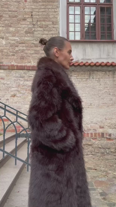 Tas nav vienkārši vēl viens kažoks — tas ir izgājiens. Garš, grūti nepamanāms, biezas šokolādes tonī mākslīgais kažoks, kas neizrotā, bet pārraksta tavu siluetu. Neuzsūc apkārtnes troksni, nepakļaujas tendencēm — tikai klusa, gandrīz teatrāla klātbūtne. Ja zini, kam šī forma paredzēta — tu jau esi viena no mūsējām.