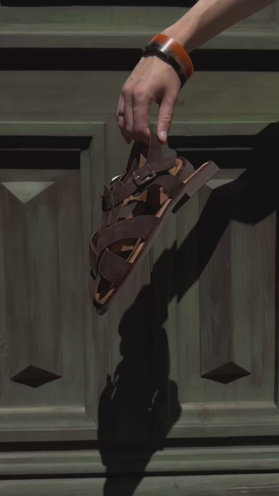 Šīs maigās zamšādas sandales balansē starp klasiku un nedaudz bīstamu estētiku. Krustotās dabīgās ādas siksniņas – kā arhitektonisks objekts uz pēdas, bet zelta sprādze smalki atgādina, ka detaļas runā skaļāk nekā logotipi. Tās ir vieglas, bet ar mugurkaulu – ne skaļas, bet no tām, kas liek atskatīties. Ja tava vasaras estētika ir izsmalcināts bohemiskums – tu esi atradusi.