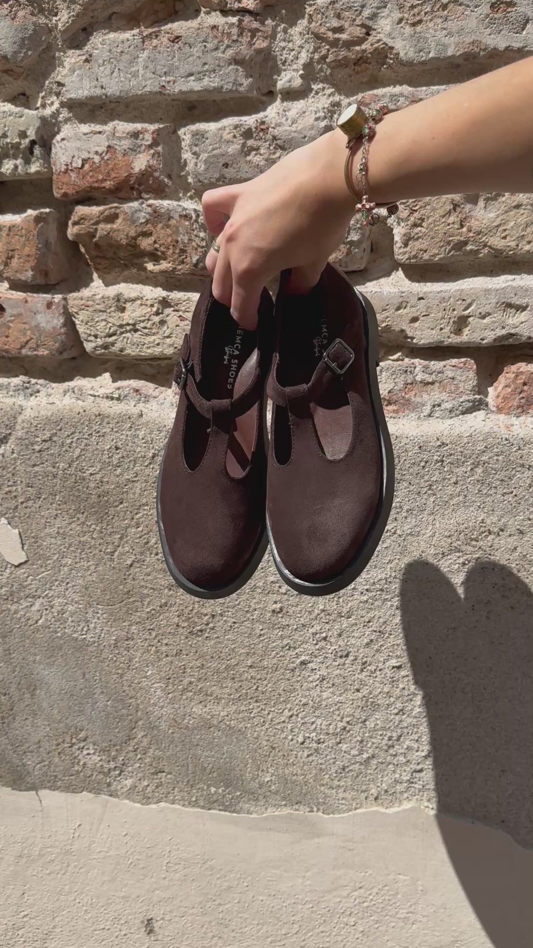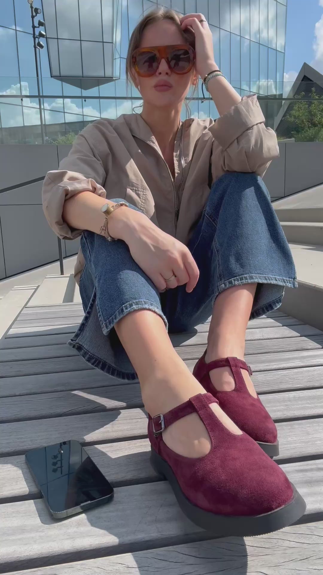 Šīs pelēcīgi brūnās Mary Jane kurpes ir kluss kontrapunkts mūsdienu pārslodzei. Velūra āda gaismu uzsūc, nevis atstaro; sprādze – ne akcents, bet ritmiska pauze siluetā. Tās piestāv nevis tāpēc, ka kliedz, bet tāpēc, ka zina, kad jāklusē.