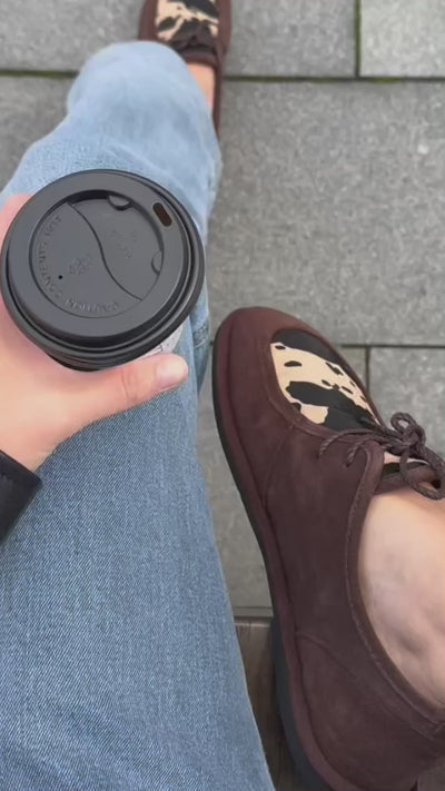 Tumši brūnais zamšs rada mierīgu fonu, kas ļauj tekstūrai izskanēt klusībā. Apavi, kas vienlaikus ir gan piesardzīgi, gan izaicinoši.