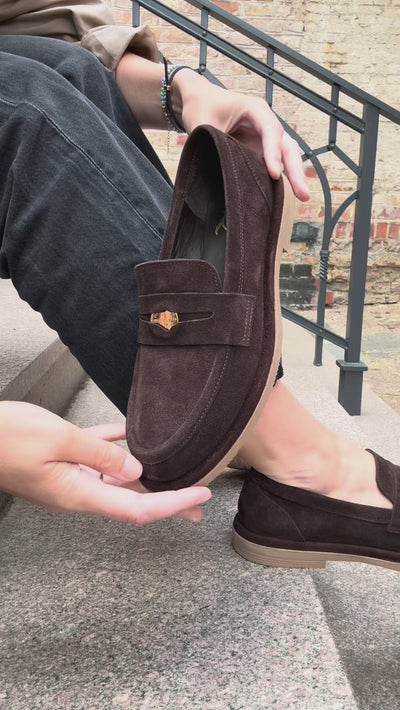 Эти лоферы – словно старый знакомый, который всегда знает, что сказать. Бархатистая текстура, глубокий оттенок тёмного шоколада и изящная золотая деталь напоминают: настоящий стиль не демонстративен, а внутренний. Они созданы не для вечера, а для настроения, когда хочется просто быть – но быть безупречно.